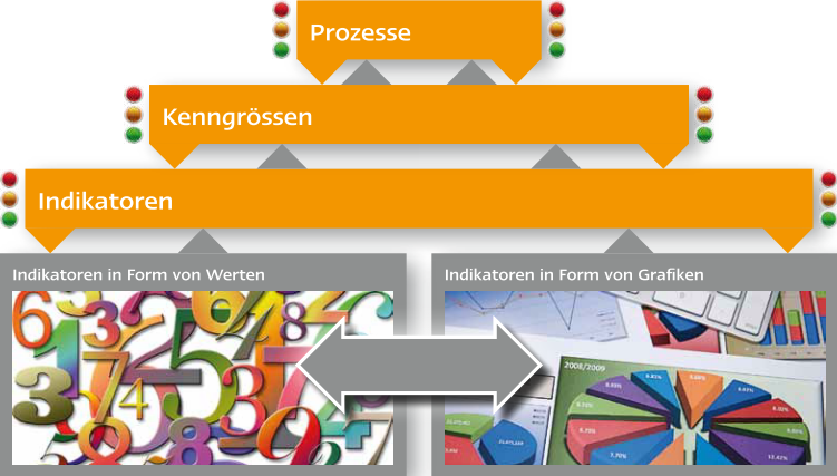 Wie der Pilot, der das Flugzeug steuert, brauchen auch Sie verschiedenste Kennzahlen Ihrer Organisation, um die richtigen Entscheidungen treffen zu können. Definieren Sie aggregierte Kennzahlen, auch Key Performance Indicators genannt, sodass Sie sich in kürzester Zeit einen Gesamtüberblick verschaffen können. Anhand Ihrer Funktion wird Ihnen ein persönliches Dashboard zusammengestellt, welches typischerweise aus Diagrammen (Charts), Zahlenlisten und Ampeln besteht. Bemerken Sie einen Negativtrend oder eine rote Ampel, können Sie sich mit nur einem Klick einen detaillierten Überblick über die entsprechende Kenngrösse verschaffen.